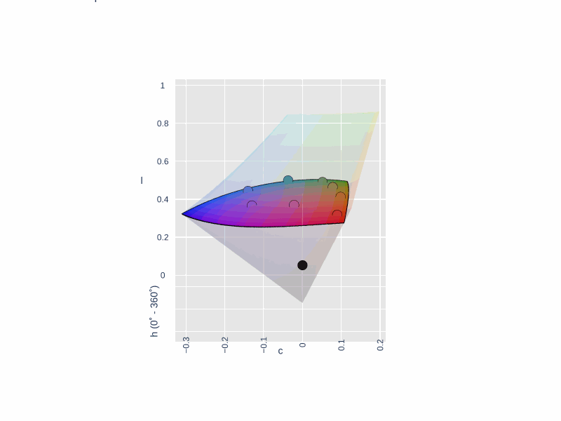 Chroma curves are designed specifically to establish a distinct role for each accent and are non-intersecting over the lightness domain (hence the distinct "bands" in the above chroma curve figure). There are eight monotone-accent pairs, plus a single grey trajectory: